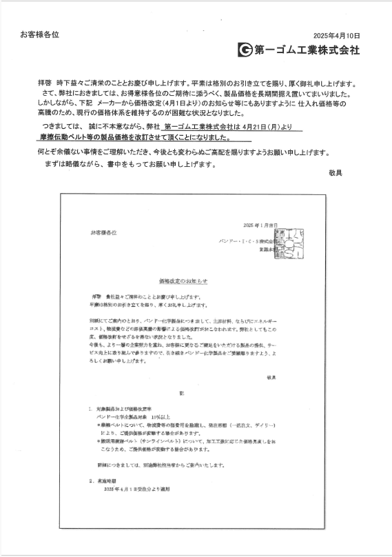 Vベルト価格改定のお知らせ
